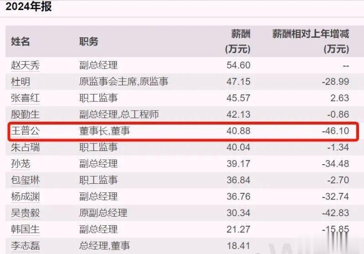 根据公司年报披露,2024年,王普公先生税前薪酬约为41万元,较2023年减少46万元,降幅超50%;该薪酬在公司高层管理人员中位列第五,公司高层最高薪酬为54.6万元,薪酬差距相对较小。