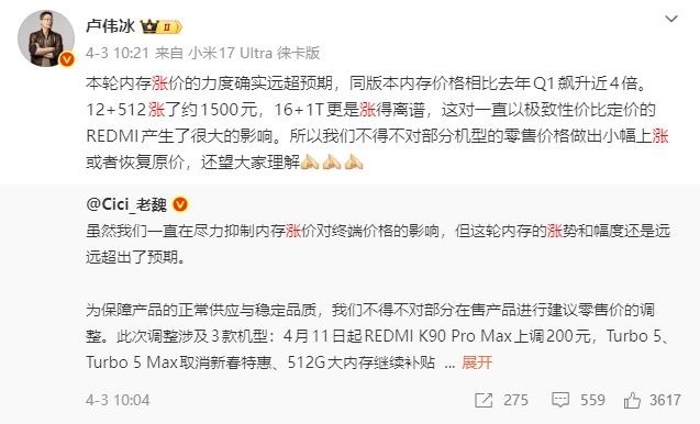 尽管网友猜测小米、OPPO、vivo均有可能调整Ultra产品线,其中小米因卢伟冰此前公开提及内存涨价影响,被网友列为重点猜测对象,但截至目前,相关信息仅为行业爆料,具体厂商与后续安排,仍需以品牌官方公告为准。